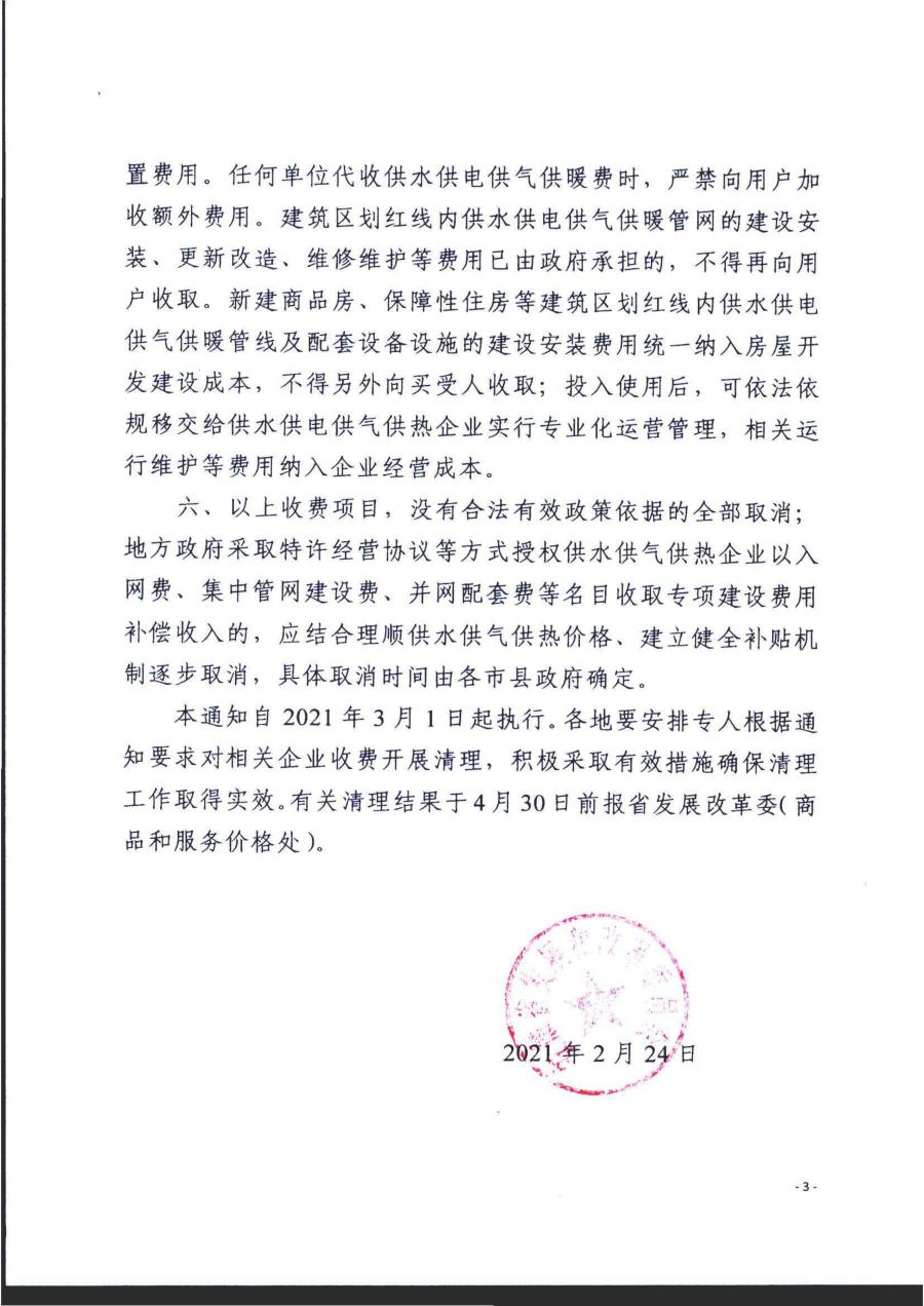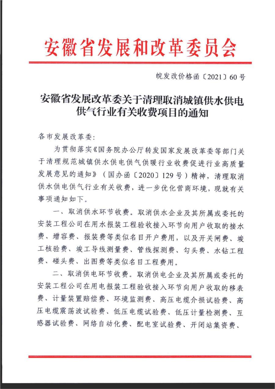 安徽省發(fā)展改革委發(fā)布關(guān)于清理取消城鎮(zhèn)供水供電供氣行業(yè)有關(guān)收費(fèi)項(xiàng)目的通知》皖發(fā)改價(jià)格函【2021】60號(hào)