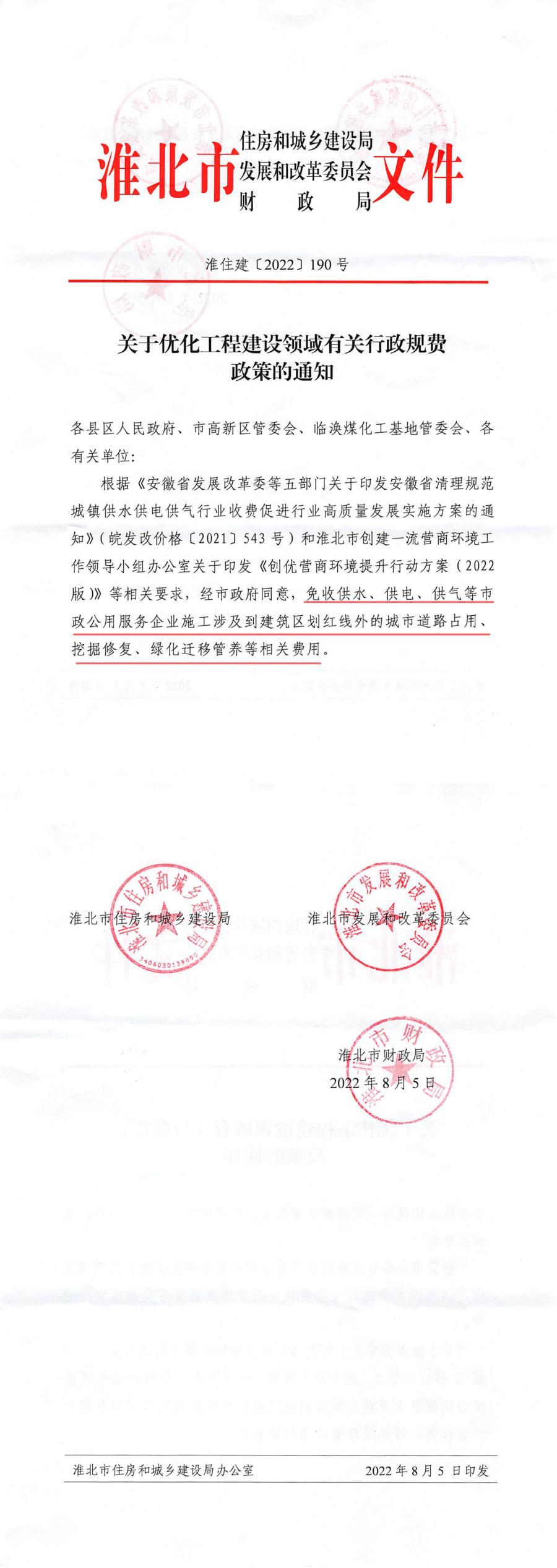 關(guān)于優(yōu)化工程建設(shè)領(lǐng)域有關(guān)行政規(guī)費(fèi)政策的通知 淮住建【2022】190號(hào)