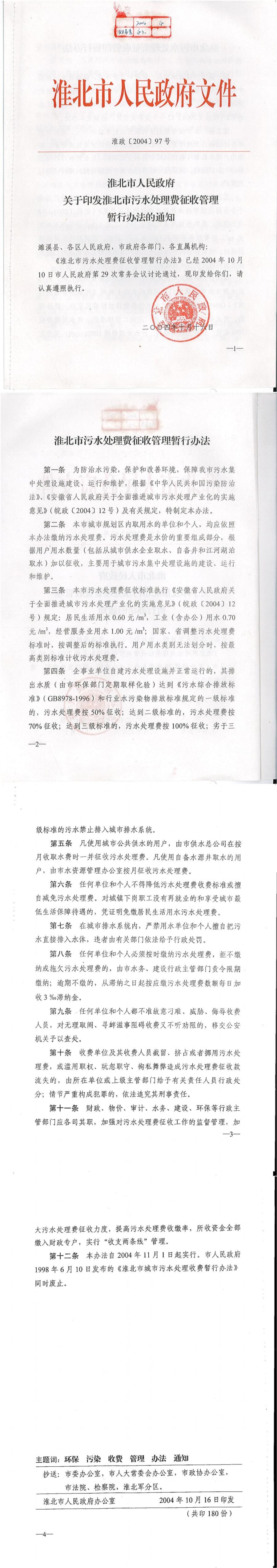 淮北市人民政府關(guān)于印發(fā)淮北市污水處理費(fèi)征收管理暫行辦法的通知 淮政【2004】97號(hào)