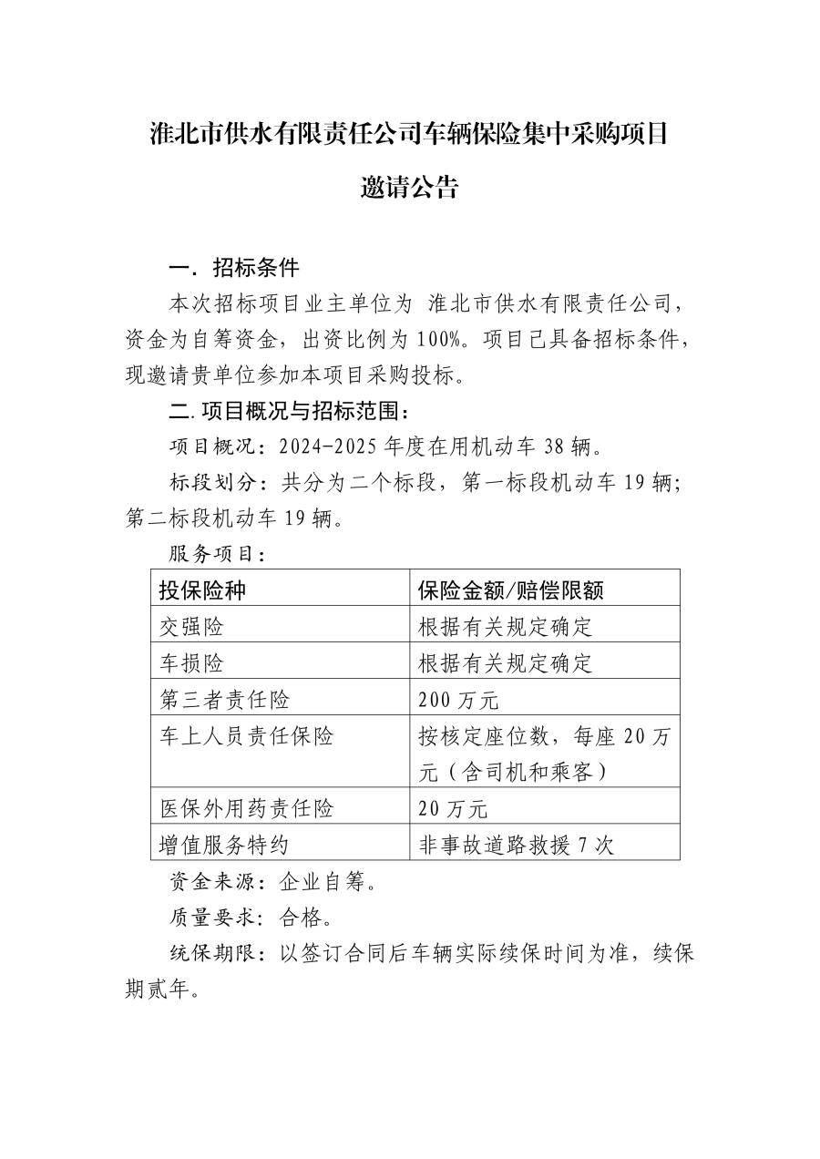 淮北市供水有限責(zé)任公司車輛保險(xiǎn)集中采購(gòu)項(xiàng)目邀請(qǐng)公告
