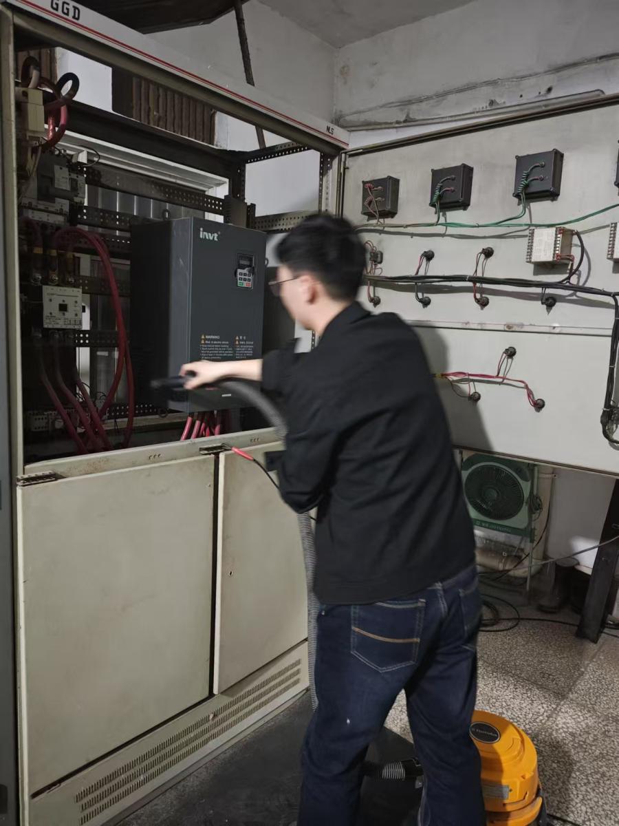 經(jīng)過仔細(xì)檢測,維修人員精準(zhǔn)定位問題:變頻器內(nèi)部灰塵堆積,散熱過慢,導(dǎo)致過熱停機(jī),遠(yuǎn)程控制設(shè)備電源故障。面對(duì)復(fù)雜的故障,他們分工明確,一組負(fù)責(zé)維修變頻器,小心翼翼清理灰塵;另一組全力搶修遠(yuǎn)程控制設(shè)備,仔細(xì)排查、重新接線更換電源。