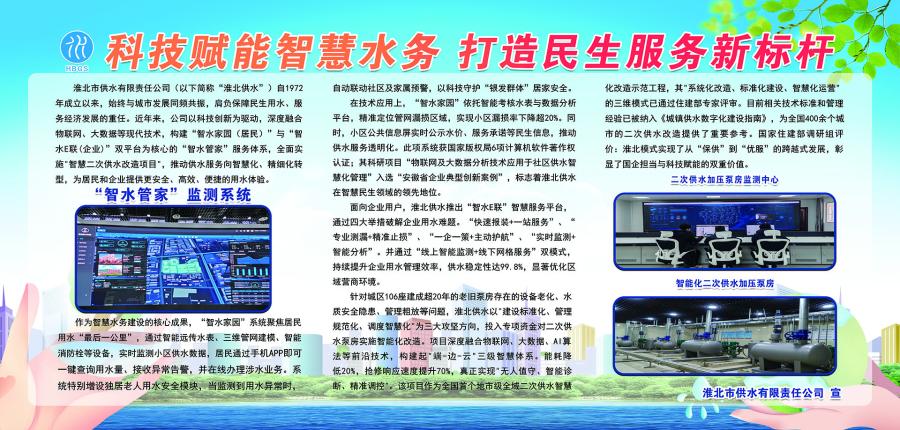 市供水公司通過“智慧水務(wù)建設(shè)”專題展板,直觀展示了智慧水務(wù)建設(shè)的核心成果,展板以“智水管家”檢測系統(tǒng)和智能化二次供水加壓泵房為亮點,呈現(xiàn)了全市供水體系在實時監(jiān)測、漏損預(yù)警、老舊泵房改造的重大突破。